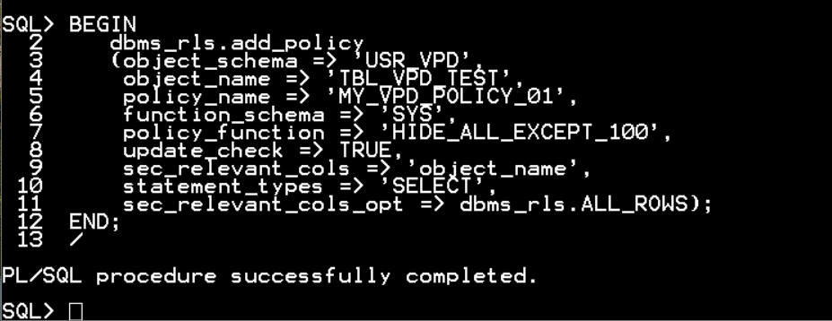 exec dbms_rls.drop_policy('USR_VPD','TBL_VPD_TEST','MY_VPD_POLICY_01');