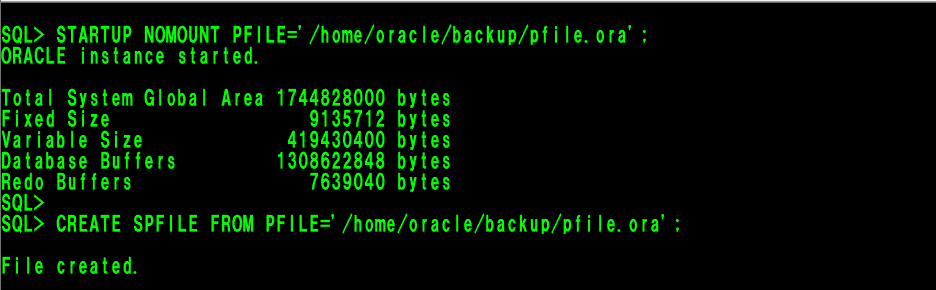 CREATE SPFILE FROM PFILE='/home/oracle/backup/pfile.ora';