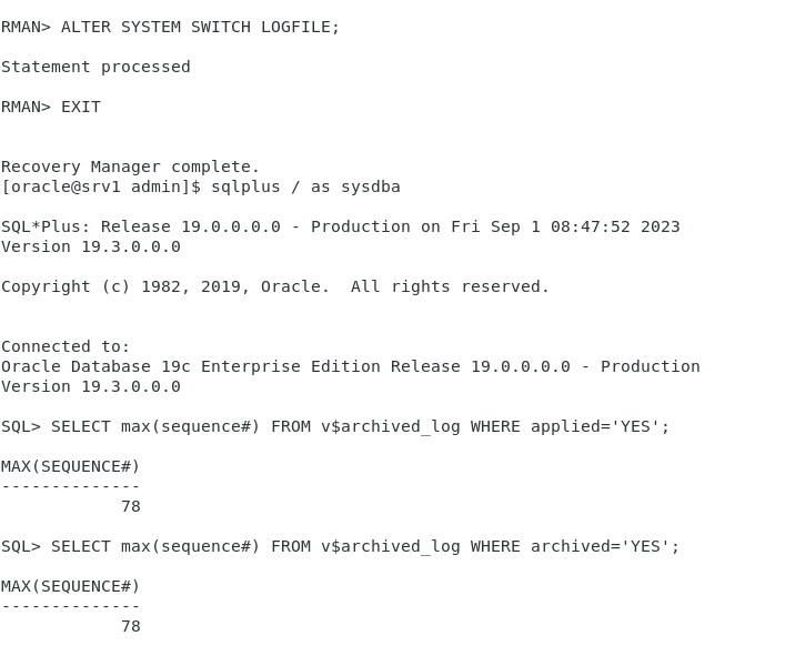 Q1. Configure archivelog deletion policy and make sure they are eligible for the deletion when they applied to the standby database. Stop the apply process on the standby database, switch log files on the primary database and make sure they are not applied to the standby database. Try to delete all archived log files on the primary database and make sure they are not deleted (because they are not applied). (10min)