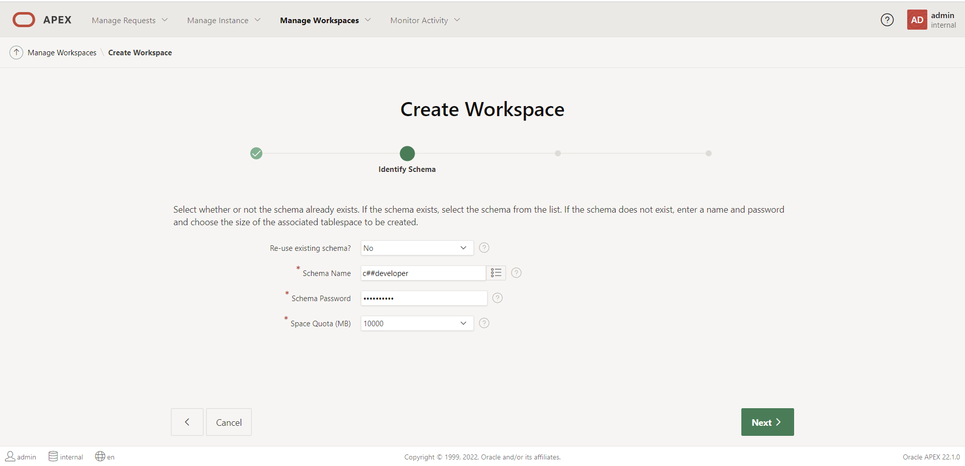 Workspace의 관리자 스키마명을 입력하고, 저장 공간 한도를 지정한다.