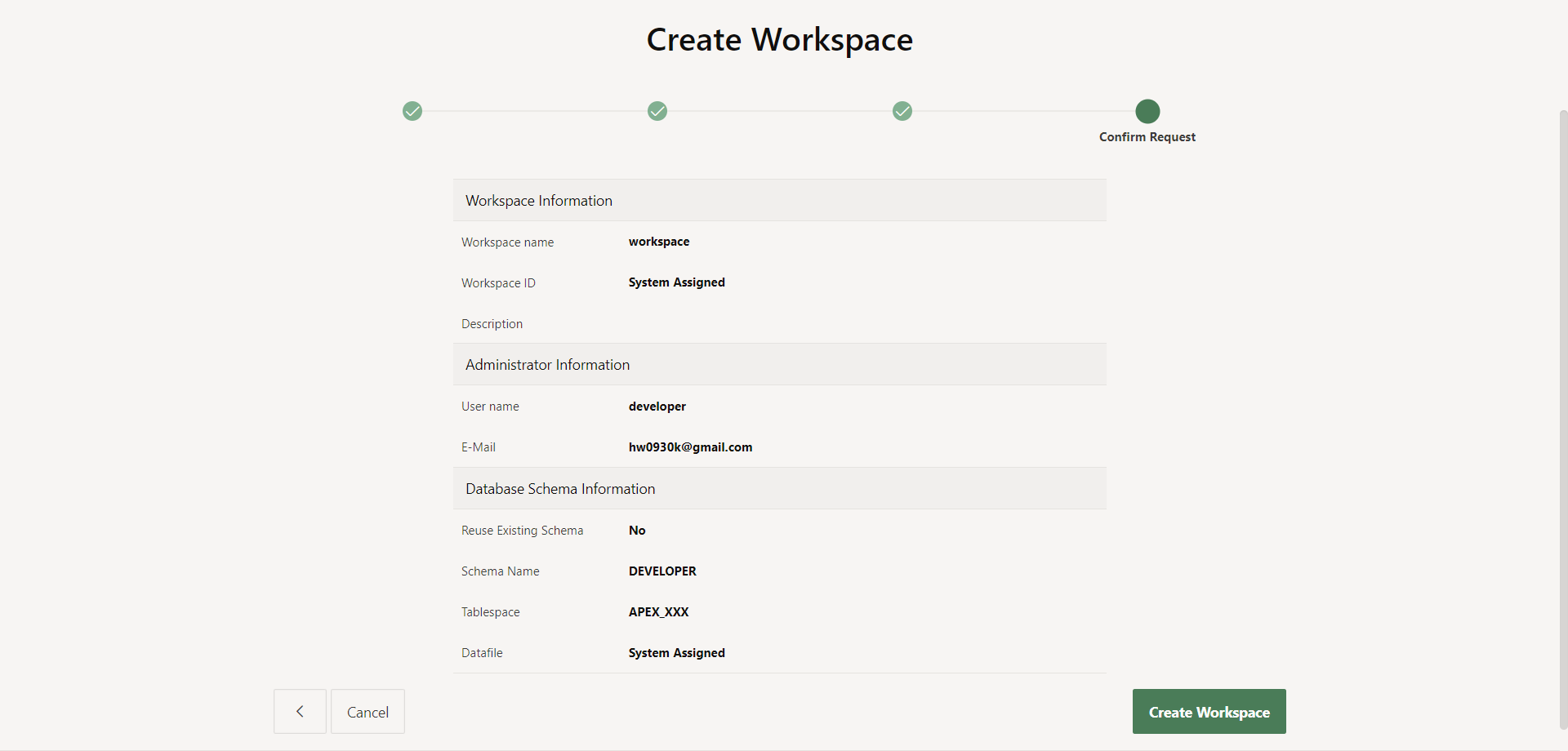 Workspace에 로그인한다. Workspace 안에 여러 어플리케이션을 설치하고 관리할 수 있다. CDB 안에 여러 PDB들이 관리되듯이, Workspace 안에 여러 어플리케이션이 관리될 수 있는 것이다.