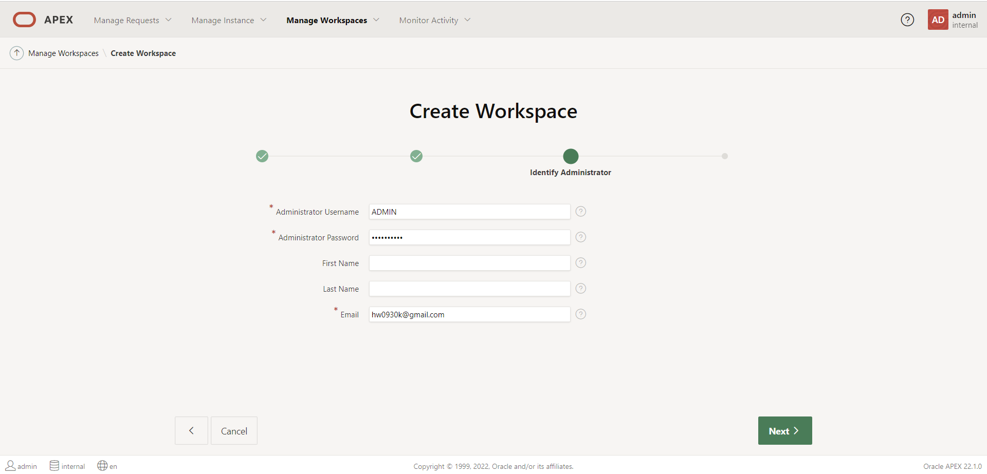 workspace의 관리자(DB가 아니라 workspace에 접속할 때 사용하는 유저의 개념)의 이름과 비밀번호를 지정한다.