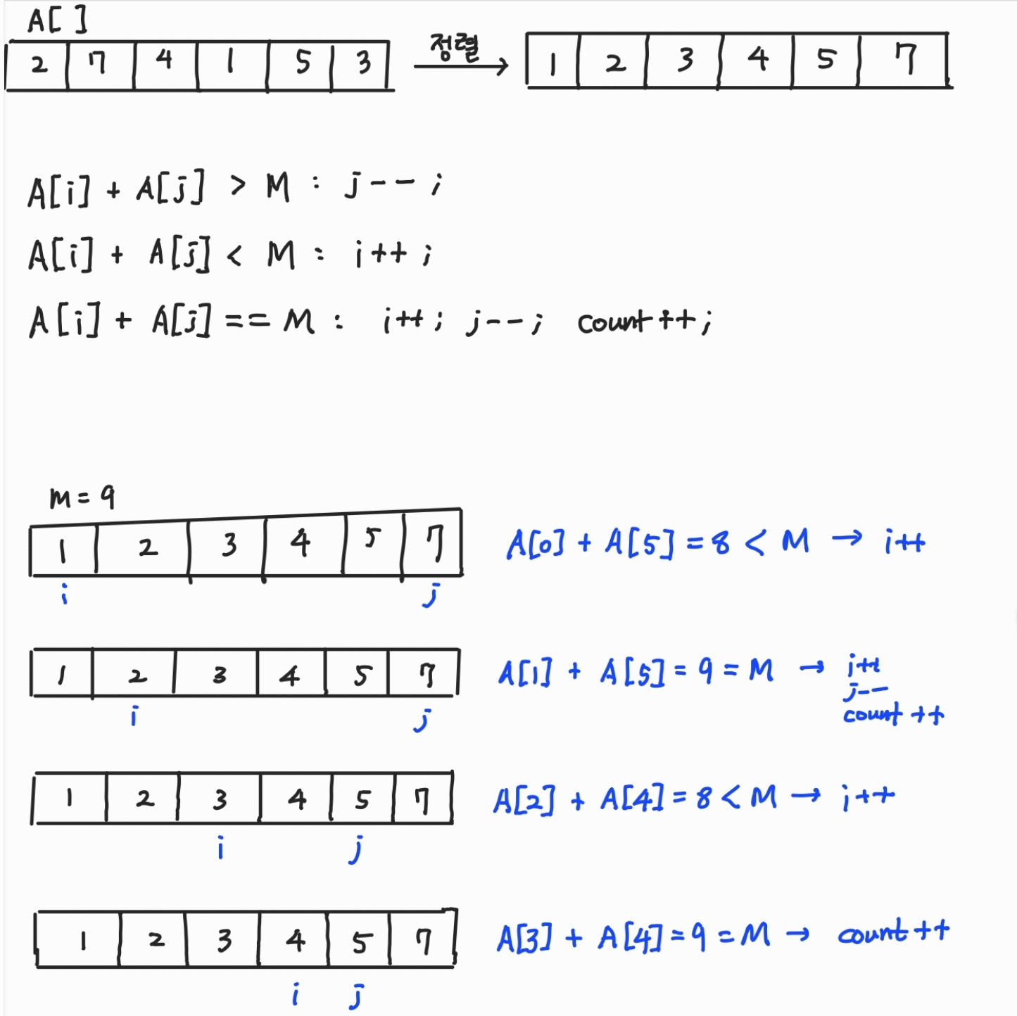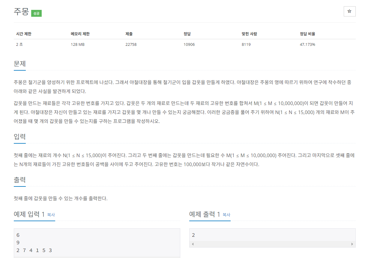 풀이: 투 포인터 알고리즘을 적용하는데, 이번에는 시작 지점에서는 포인터를 배열의 시작점과 끝점에 위치하여 차례로 포인터 간의 위치를 줄여가는 알고리즘을 이용하면 보다 편하게 문제를 해결할 수 있다.