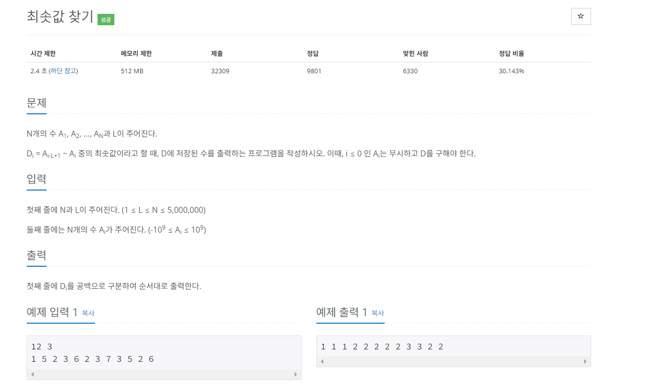 1 2 3 4 5 6 7 8 9 10 11 12 13 14 15 16 17 18 19 20 21 22 23 24 25 26 27 28 29 30 31 32 33 34 35 36 37 38 39 40 41 42 43 | import java.util.*; import java.io.*; public class Q11003 { public static final Scanner scanner = new Scanner(System.in); public static void main(String[] args) throws IOException { BufferedReader br = new BufferedReader(new InputStreamReader(System.in)); BufferedWriter bw = new BufferedWriter(new OutputStreamWriter(System.out)); StringTokenizer st = new StringTokenizer(br.readLine()); int N = Integer.parseInt(st.nextToken()); int L = Integer.parseInt(st.nextToken()); st = new StringTokenizer(br.readLine()); Deque<Node> mydeque = new LinkedList<>(); for (int i = 0; i < N; i ++) { int now = Integer.parseInt(st.nextToken()); while (!mydeque.isEmpty() && mydeque.getLast().value > now) { mydeque.removeLast(); } mydeque.addLast(new Node(now, i)); if (mydeque.getFirst().index <= i - L) { mydeque.removeFirst(); } bw.write(mydeque.getFirst().value + " "); } bw.flush(); bw.close(); } static class Node { public int value; public int index; Node(int value, int index){ this.value = value; this.index = index; } } } | cs |