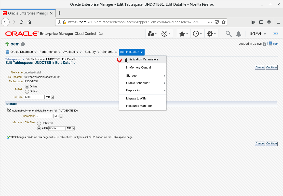 문제 3: OEM Cloud Control에서 초기화 파라미터를 변경하라. (5분)
