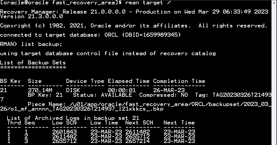 LIST BACKUP;