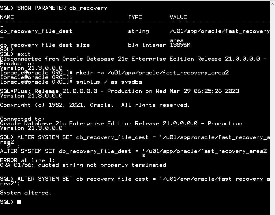 ALTER SYSTEM SET db_recovery_file_dest = '/u01/app/oracle/fast_recovery_area2' SCOPE=SPFILE;