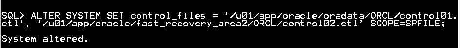 ALTER SYSTEM SET control_files='/u01/app/oracle/oradata/ORCL/control01.ctl', '/u01/app/oracle/fast_recovery_area2/ORCL/control02.ctl' SCOPE=SPFILE;