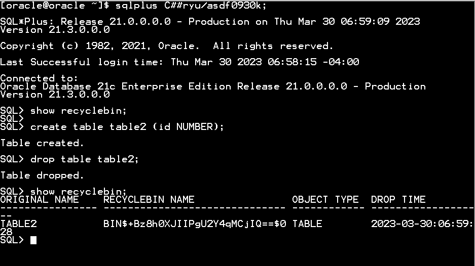 /* DROP TABLE을 해도 사실은 완전히 데이터가 삭제되는 것은 아닐 수 있다. recycle bin이 활성화 된 상태라면, drop된 테이블이 system-generated된 이름으로 변경되어 recyclebin에 보관될 것이다. */