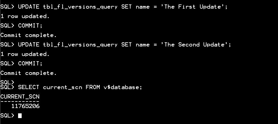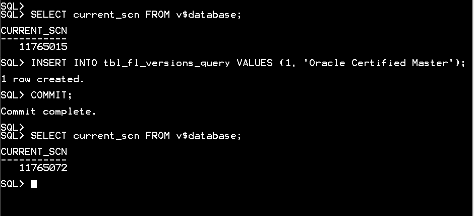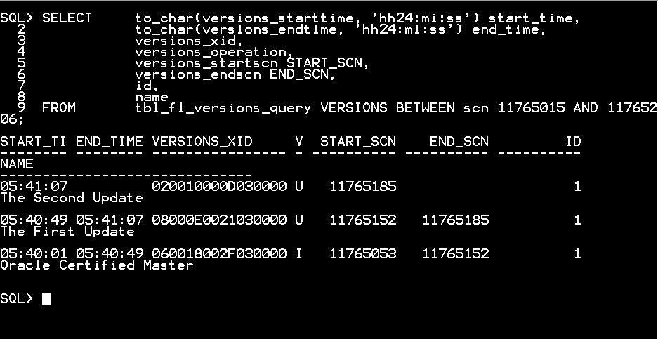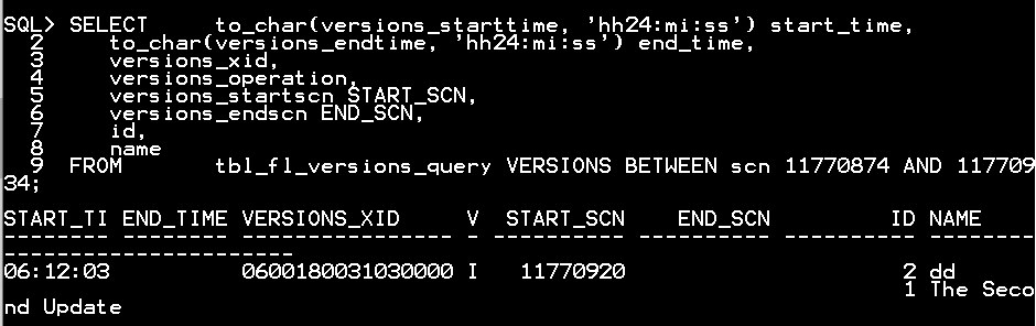 FROM tbl_fl_versions_query VERSIONS BETWEEN scn 11765015 AND 11765206;