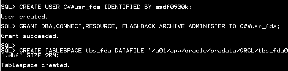 GRANT DBA,CONNECT, RESOURCE, FLASHBACK ARCHIVE ADMINISTER TO C##usr_fda;