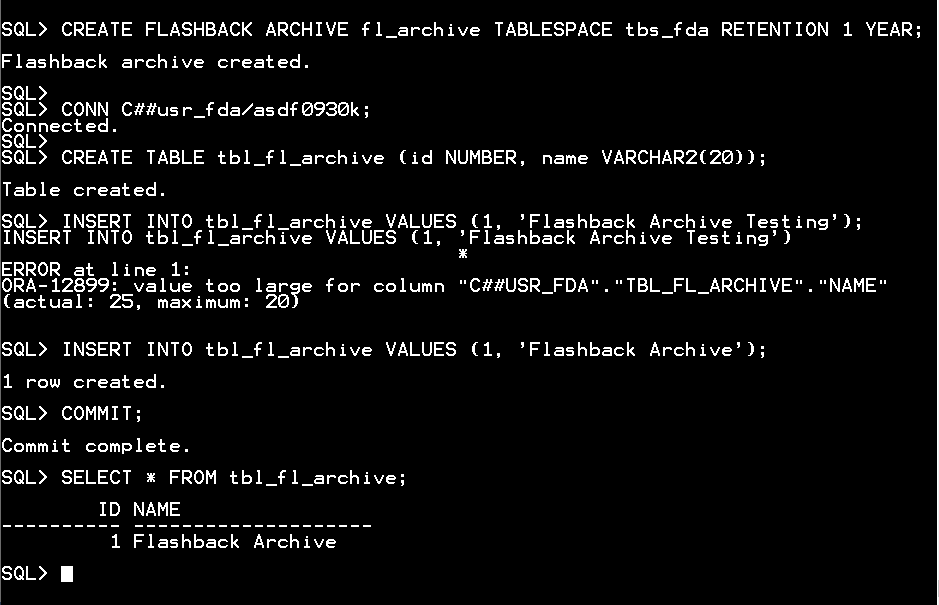 INSERT INTO tbl_fl_archive VALUES (1, 'Flashback Archive');