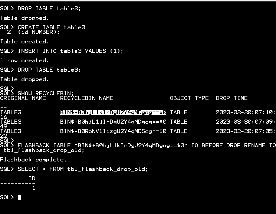 FLASHBACK TABLE "BIN$B0hjL1kIrDgU2Y4qMDgog==$0" TO BEFORE DROP RENAME TO flashback_drop_old;