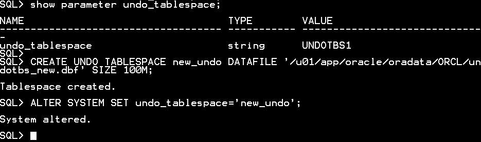 CREATE UNDO TABLESPACE new_undo DATAFILE '/u01/app/oracle/oradata/ORCL/undotbs_new.dbf' SIZE 100M;