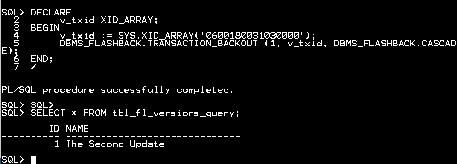 DBMS_FLASHBACK.TRANSACTION_BACKOUT (1, v_txid, DBMS_FLASHBACK.CASCADE);