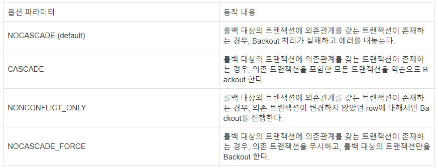 /* Transaction Backout 기능에는 dependencies를 관리하기 위해 NOCASCADE, CASCADE, NONCONFLICT_ONLY, NOCASCADE_FORCE 옵션이 존재한다. */