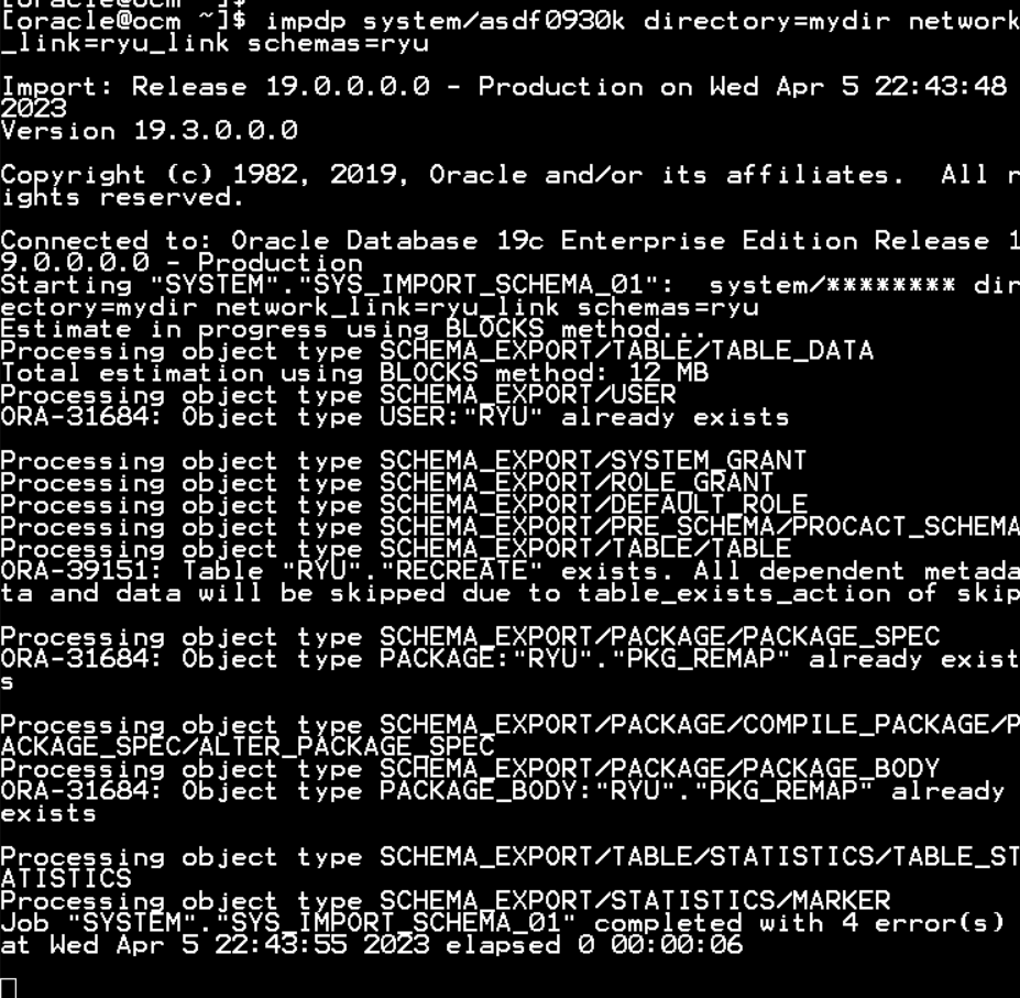 $ impdp system/asdf0930k directory=mydir dumpfile=net_link_01.dmp network_link=ryu_link schemas=ryu'Oracle > OCM Journey' 카테고리의 다른 글