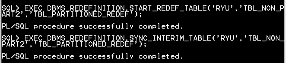 EXEC DBMS_REDEFINITION.SYNC_INTERIM_TABLE('RYU','TBL_NON_PART2','TBL_PARTITIONED_REDEF');