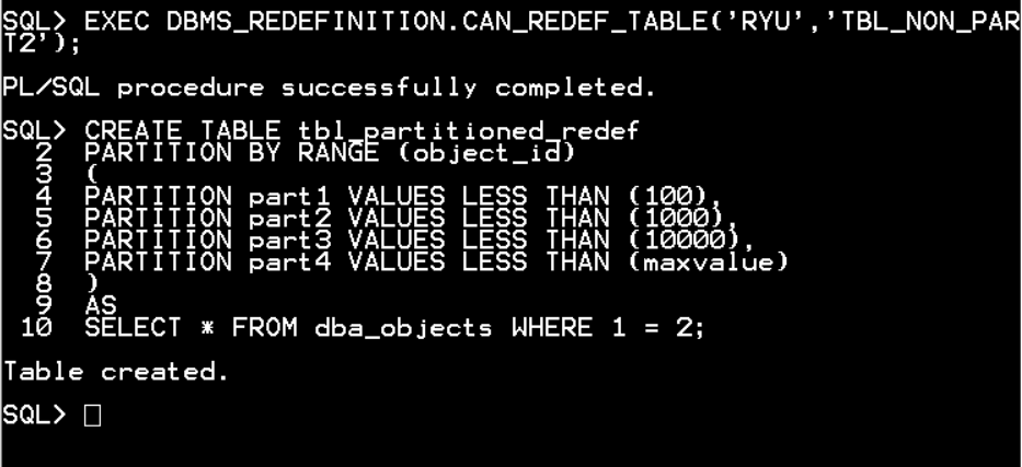 EXEC DBMS_REDEFINITION.START_REDEF_TABLE('RYU','TBL_NON_PART2','TBL_PARTITIONED_REDEF');