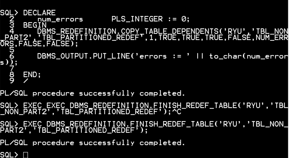 DBMS_REDEFINITION.COPY_TABLE_DEPENDENTS('RYU','TBL_NON_PART2','TBL_PARTITIONED_REDEF',1,TRUE,TRUE,TRUE,FALSE,NUM_ERRORS,FALSE,FALSE);